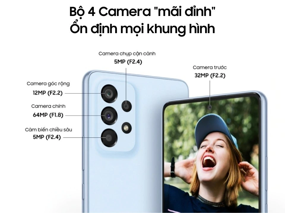 Galaxy A53 5G được trang bị cụm 4 camera với camera chính 64MP siêu nét, ống kính góc siêu rộng 12MP, ống kính macro 5 MP và cảm biến độ sâu 5 MP. Kết hợp cùng chế độ quay chống rung OIS chuyên nghiệp thế hệ mới duy nhất trên thế hệ Galaxy A, kế thừa công nghệ tiên phong hàng đầu của Samsung.